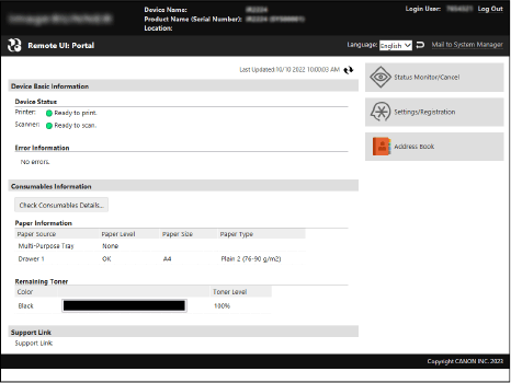 When you log in to Remote UI, the Portal page (Remote UI top page) appears. From here you can check the operations status of the machine, view various information, and change the settings with button operations.