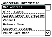 In addition to the MAC address and connection information of the wireless LAN when the machine is connected to the wireless LAN, you can also view the security settings.