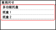 纸张设置屏幕显示已注册的常用纸张尺寸。 如果显示未使用的纸张尺寸,可以为每个纸张来源隐藏这些尺寸,以方便选择纸张尺寸。