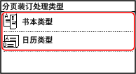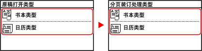 1 | 在复印画面上按 [双面]  [原稿/分页装订处理类型]。 显示 [原稿/分页装订处理类型] 画面 |