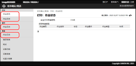 使用管理员模式或部门ID登录远程用户界面时,将显示所有打印作业的状态。