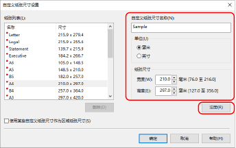 输入自定义尺寸纸张名称和纸张尺寸,然后单击 [注册]。