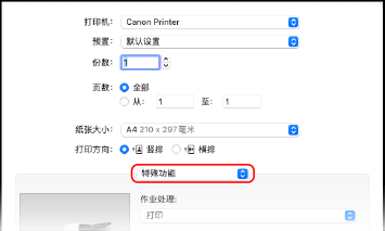 2 | 从打印选项弹出菜单中,选择 [特殊功能]。 如未显示打印选项,请单击打印对话框中的 [显示详细信息]。 |