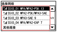 搜索要连接的无线局域网路由器(接入点),然后输入网络密钥。 当使用接入点设置方法连接时,WPA/WPA2/WPA3的加密方法设置为AES-CCMP。 当想要使用不同的加密方法时,请使用手动设置方法连接。 若要使用不同的验证或加密方法,请使用手动设置方法进行连接。通过设置详细信息连接无线局域网(手动设置方法) |