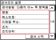 3 | 검색 항목을 선택하고 검색 문자열을 지정합니다. 검색할 문자열을 입력하고 [확정]을 누릅니다. 검색 항목을 여러 개 지정할 수 있습니다. |