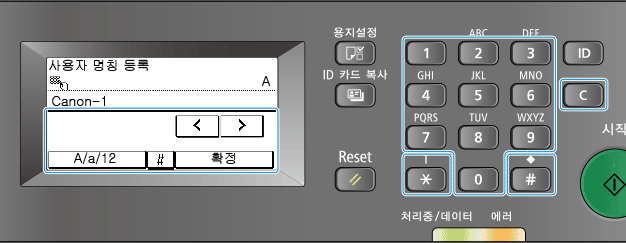 조작 패널의 숫자 키를 사용하여 영숫자 문자를 입력합니다.