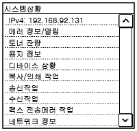 을 누르면 이 화면이 표시됩니다. 이 화면을 사용하여 기기 정보, 사용량 및 로그, 네트워크 설정, 오류 정보를 확인합니다. [시스템상황] 화면