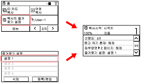 [홈] 화면의 [복사의 즐겨 찾기 설정] 버튼 또는 복사 기능 화면에서 등록된 설정을 호출하여 작업을 빠르게 수행할 수 있습니다. 설정을 호출한 후 필요에 따라 변경할 수도 있습니다.