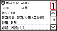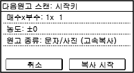 1 | 원고대에 다음 원고를 놓고 조작 패널에서  을 누릅니다. 다음 원고가 스캔되고 동일한 화면이 표시됩니다. 모든 원고의 스캔이 완료될 때까지 이 과정을 반복합니다. [농도] 및 [원고 종류]를 눌러 각 원고에 대한 설정을 변경할 수 있습니다. 지정된 복사 설정에 따라 [원고 종류]를 변경할 수 없습니다. 원고의 크기가 다른 경우 이미지의 일부가 누락되거나 이미지가 더 작게 인쇄될 수 있습니다. |