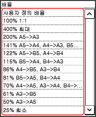 목록에서 고정 배율을 선택하거나, [사용자 정의 배율]을 선택하고 숫자 키를 사용하여 사용자 지정 비율을 입력합니다.