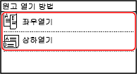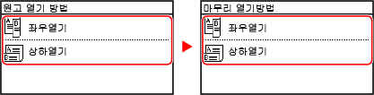 1 | 복사 화면에서 [양면]  [열기 방법 설정]을 누릅니다. [열기방법 설정] 화면이 표시됩니다. |