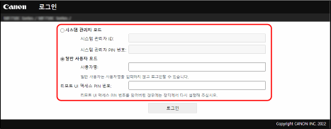 리모트 UI를 사용하려면 기기의 IP 주소를 컴퓨터의 웹 브라우저에 입력하고, 관리자 모드 또는 일반 사용자 모드로 로그인합니다. 리모트 UI로 사용할 수 있는 기능은 로그인한 모드에 따라 다릅니다.