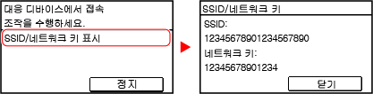 1 | [SSID/네트워크 키 표시]를 눌러 기기의 SSID와 네트워크 키를 확인합니다. |