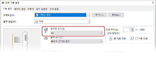 [기본 설정] 탭의 [페이지 크기]에서 문서의 용지 크기를 선택합니다.