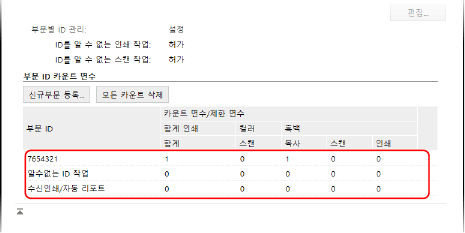 부서 ID 관리를 활성화한 경우 각 부서 ID에 대해 인쇄 및 복사된 페이지 수를 볼 수 있습니다.