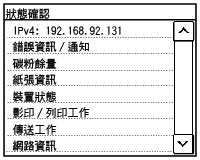 時會顯示此畫面。此畫面可用來檢查本機資訊、使用情況和記錄、網路設定和錯誤資訊。