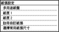 在 [首頁] 畫面中按下 [紙張設定] 時會顯示此畫面。此畫面可用來指定本機的各種設定。
