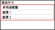 紙張設定畫面會顯示註冊的常用紙張尺寸。如果顯示未使用的紙張尺寸,您可以對於各個紙張來源隱藏這些尺寸,以便更容易選擇紙張尺寸。