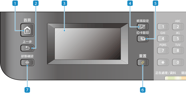 按此鍵可選擇紙張來源,如紙匣或多用途紙盤,並註冊紙張尺寸和類型。