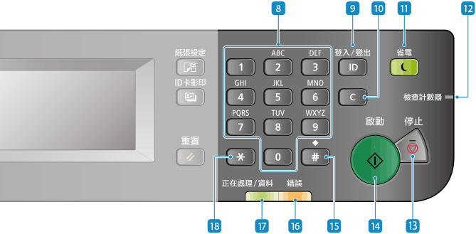 若已啟用部門 ID 管理和管理員 ID,輸入 ID 和 PIN 後按此鍵即可登入。結束使用本機後,再按一次此鍵即可登出。