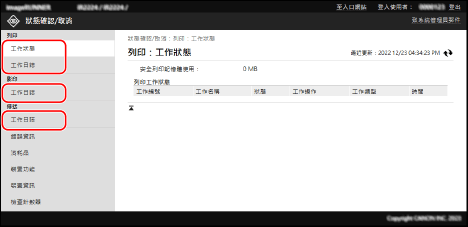 當您使用管理員模式或部門 ID 登入遠端使用者介面時,會顯示所有列印工作的狀態。