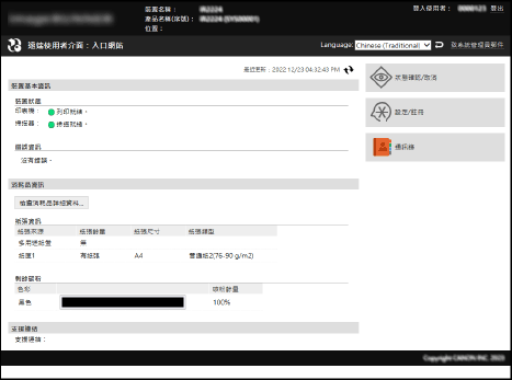 您登入到遠端使用者介面時,入口網站頁面(遠端使用者介面首頁)會出現。您可以從其中檢查本機的操作狀態、檢視各種資訊,以及藉由按鈕操作變更設定。
