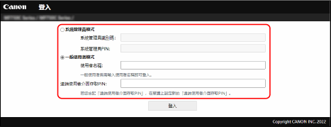 如果設定部門 ID 管理,您必須使用部門 ID 登入。您登入的模式因管理員 ID 設定而不同。