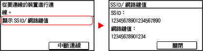 1 | 按下 [顯示SSID/網路鍵值] 以檢查本機的 SSID 及網路金鑰。 |