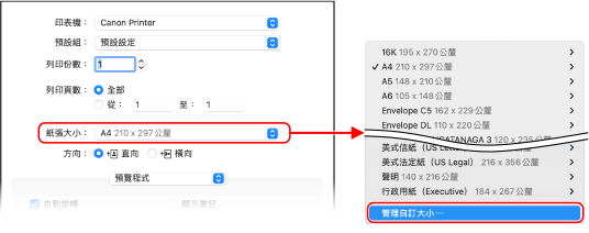 在列印選項的 [紙張大小] 中,選擇 [管理自訂大小]。