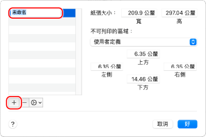 按一下左下角的 [+],按兩下 [未命名],然後輸入自訂尺寸紙張名稱。