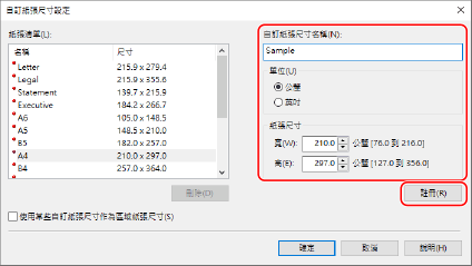 輸入自訂尺寸紙張名稱和紙張尺寸,然後按一下 [註冊]。