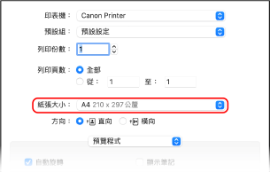 在列印選項的 [紙張大小] 中,選擇文件的紙張尺寸。