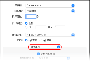 1 | 從列印選項快顯功能表中,選擇 [紙張處理]。 |