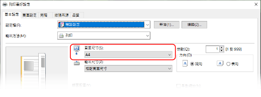 在 [基本設定] 索引標籤上的 [頁面尺寸] 中,選擇文件的紙張尺寸。