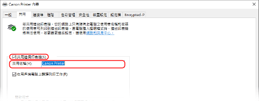 在 [共用] 索引標籤上,選取 [共用這個印表機] 核取方塊,然後輸入共用名稱。