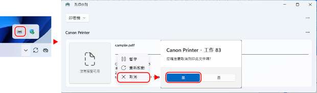 如未會顯示上述畫面,請按兩下 Windows 通知區域中的印表機圖示,選擇要取消的文件,然後按一下 [文件]