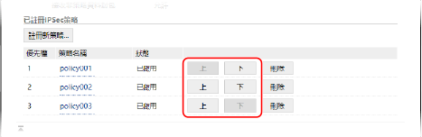 按一下策略名稱右側的 [上] 或 [下],設定優先順序。較高層級的策略優先套用於 IPSec 通訊。