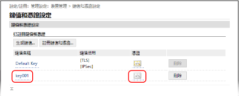 在 [鍵值和憑證設定] 畫面的 [已註冊鍵值和憑證] 中顯示的憑證圖示會從 [