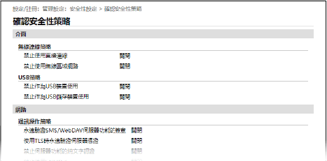 在其他裝置或軟體上設定的內容將套用於本機的安全策略。因此,安全策略中可能存在本機上不可用的功能項目,不過這些項目不影響本機的設定或操作。