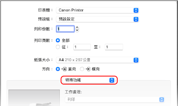 2 | 從列印選項快顯功能表中,選擇 [特殊功能]。 如果列印選項未顯示,按一下列印對話方塊中的 [顯示詳細資訊]。 |