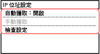 2 | 視需要指定自動擷取設定。 [選擇通訊協定] 通常,設定為 [DHCP]。不過,在無法使用 DHCP 的環境中設定 [DHCP] 時,本機將繼續在網路中確認自動取得功能,因而產生不需要的通訊。不使用 DHCP 時,請將此設定為 [關閉]。 [自動獲取IP] 通常,設定為 [開啟]。雖然優先使用 DHCP 分配的 IP 位址,不過,如果沒有來自 DHCP 的回應,將使用自動 IP。 |
