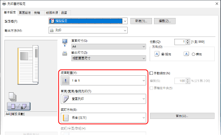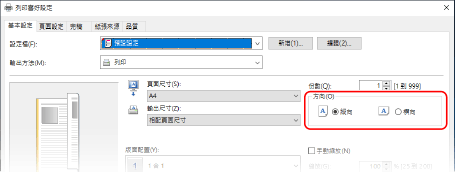 在驅動程式的 [基本設定] 畫面上,將 [方向] 設為和步驟 1 中設定相同的方向。
