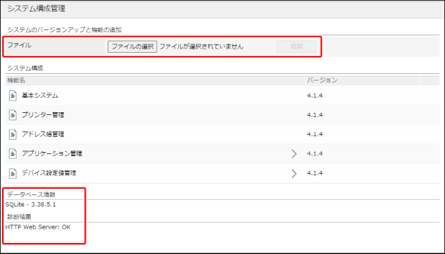 [システム構成管理]ページに、追加されている機能の名称とバージョンが表示されます。