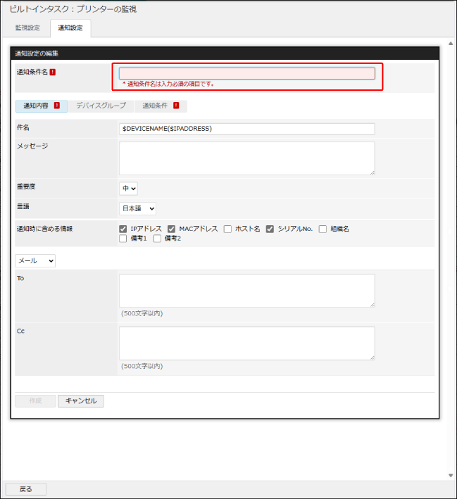 [To]/[Cc] | 通知先のEメールアドレスを入力します。複数のアドレスを設定する場合は、コンマまたは改行で区切って入力します。 通知方法として[メール]を選択した場合に表示されます。 |