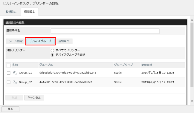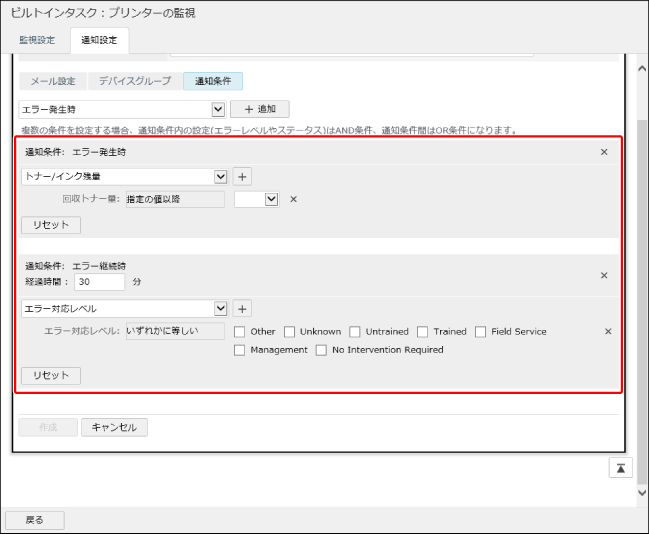 [トナー/インク残量] | トナーまたはインクの残量を、パーセントで指定します。入力値以下になった場合に通知されます。 |