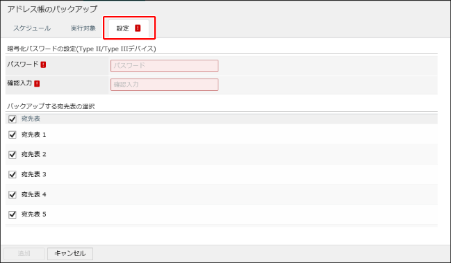 Type IIのプリンターのアドレス帳は、デバイス設定値の形式でバックアップされます。そのため、デバイス設定値を暗号化するためのパスワードの設定が必要です。