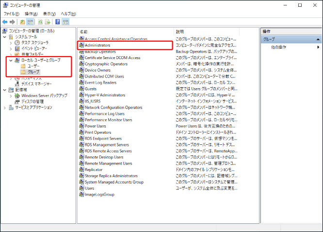 [ローカルユーザーとグループ] > [グループ]から、[Administrators]をダブルクリックします。