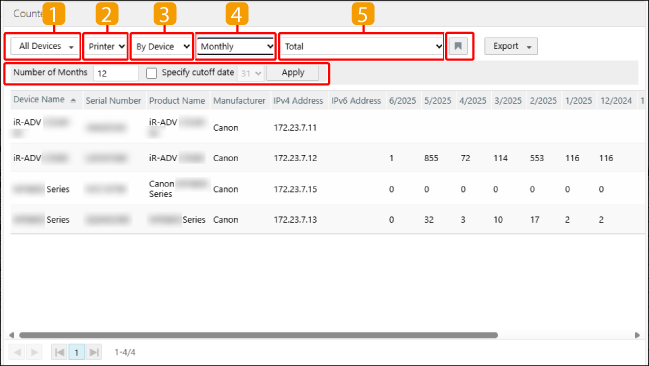 Totals are performed according to the time zone of the region where the device is running. The target for totaling is the information within the period set on the page indicated below. If the specified total period is longer than this period, some old information may be left out. [Devices] menu > [Device Communication Settings] > [Data Retention Period] tab Devices that do not support the counter retrieval function of this software are not displayed in the list. Counter retrieval results can also be sent via e-mail. For details, see the following. The counter information can also be checked on the dashboard. |