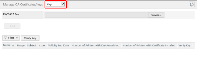 [Number of Printers with Certificate Registered] | The number of printers with the key installed. Click this to display a list of the installed printers. |