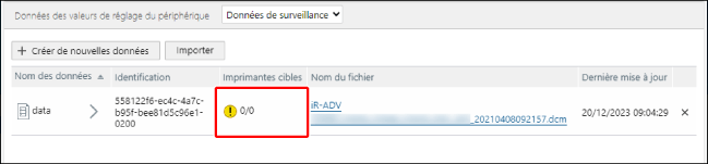 Dans la liste de la page [Données des valeurs de réglage du périphérique], cliquez sur [Imprimantes cibles] pour les données de valeurs de réglage du périphérique.